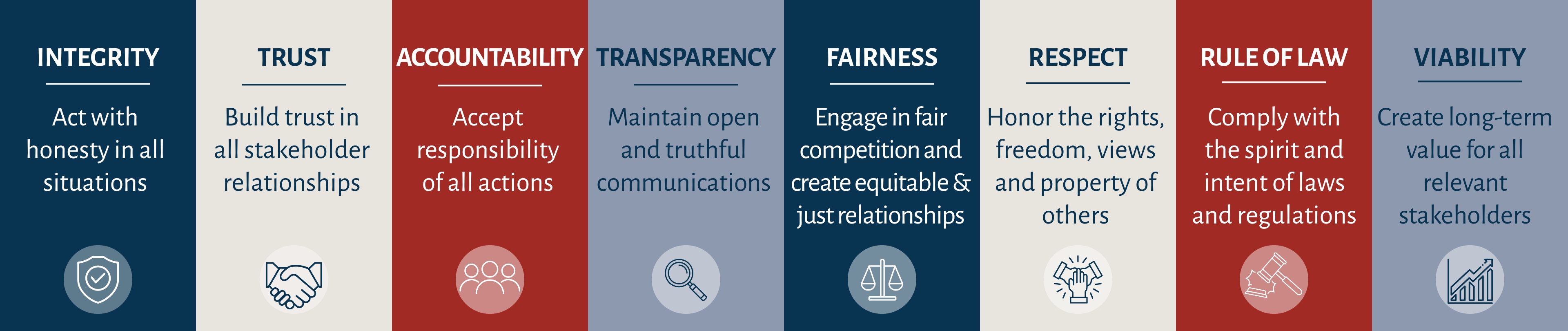 - Rule of Law: Comply with the spirit and intent of laws and regulations.